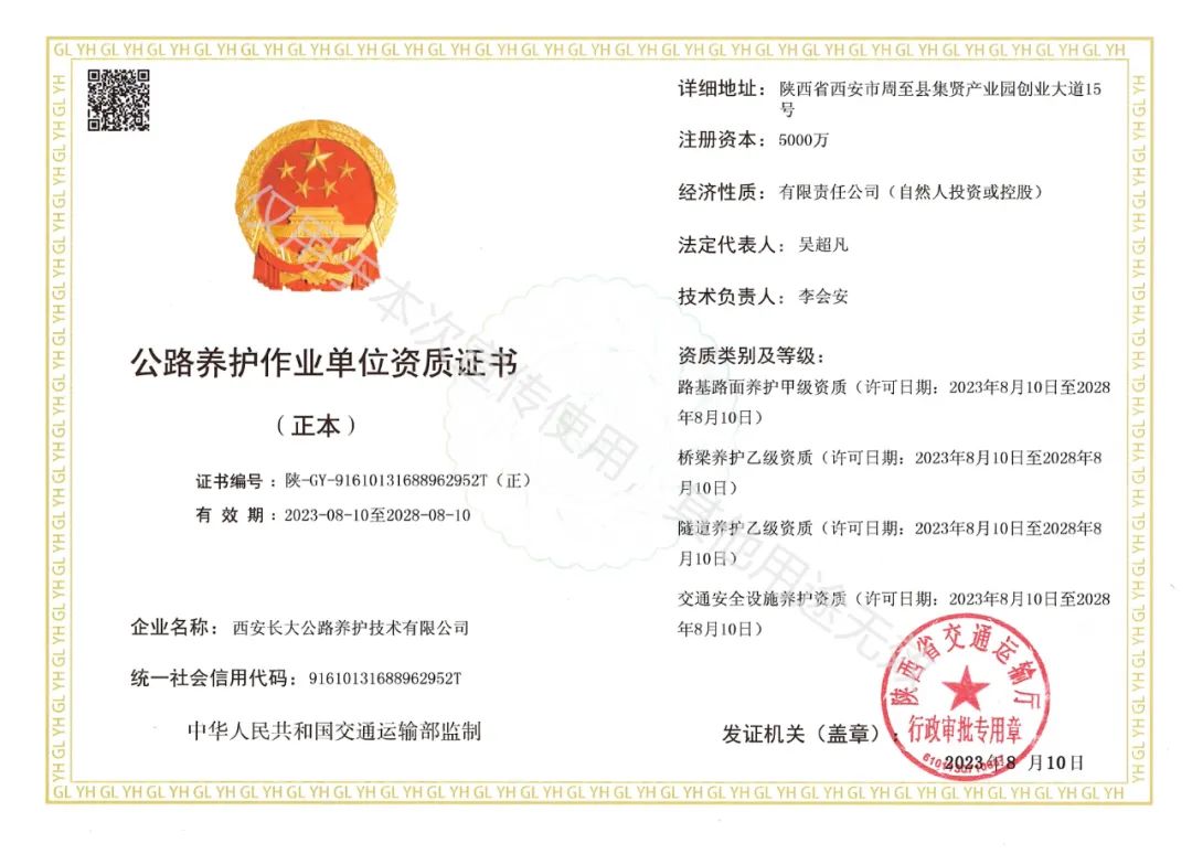 2023年8月10日,西安长大公路养护技术有限公司正式取得由陕西省交通运输厅颁发的公路养护作业单位资质证书...